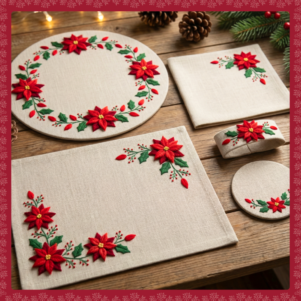 – 5 Diseños para bordar que forman parte del Juego de Mesa Navideño (Individual, servilleta, aro de servilleta, panetonera, posavasos).