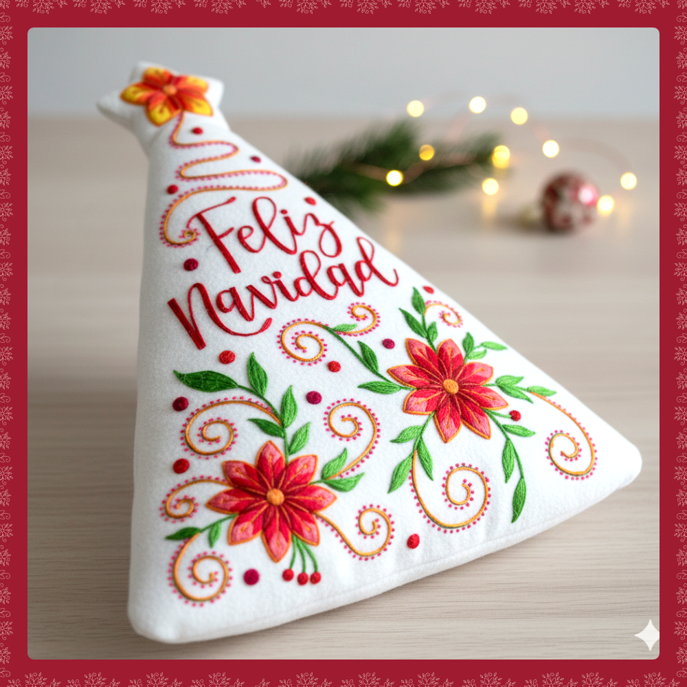 Incluye: Diseño de Cojín de Árbol Navideño con Frase de Feliz Navidad, indicaciones de bordado y sugerencia de colores del diseño.