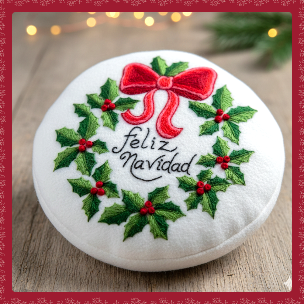 Incluye: Diseño de Cojín Redondo de Corona de Acebo y Moño Rojo, indicaciones de bordado y sugerencia de colores del diseño.